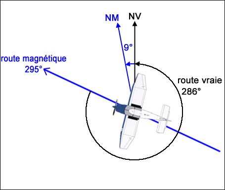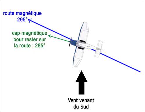 ” le vent en orientant le nez de notre aéronef du côté du vent, c'est à dire vers le Sud, notre cap magnétique sera donc inférieur à la route.